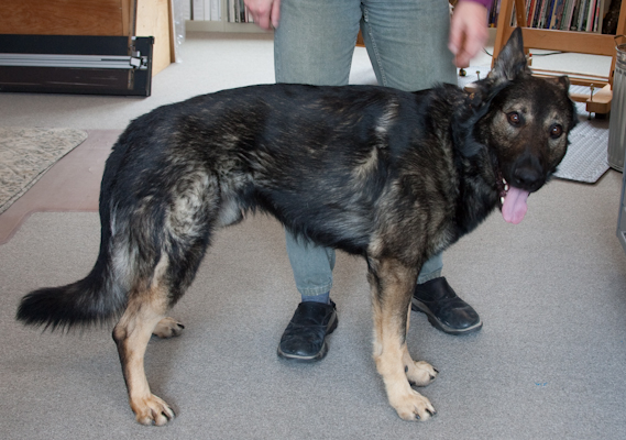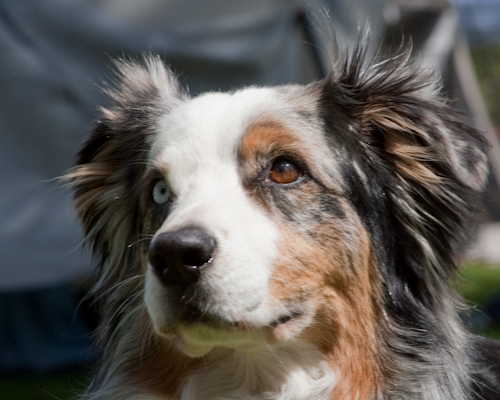 This is a good example of a GOOD photo: close-up on the head, catchlight in the eyes, highlight on the nose leather. This photo is the basis for the "blue merle Aussie" portrait (see the Gallery page for the finished artwork). The original photo is 8+ MB, so I have a lot of information in the highlights and the shadows - what's shown here is a low-res web version of a large, beautiful image.